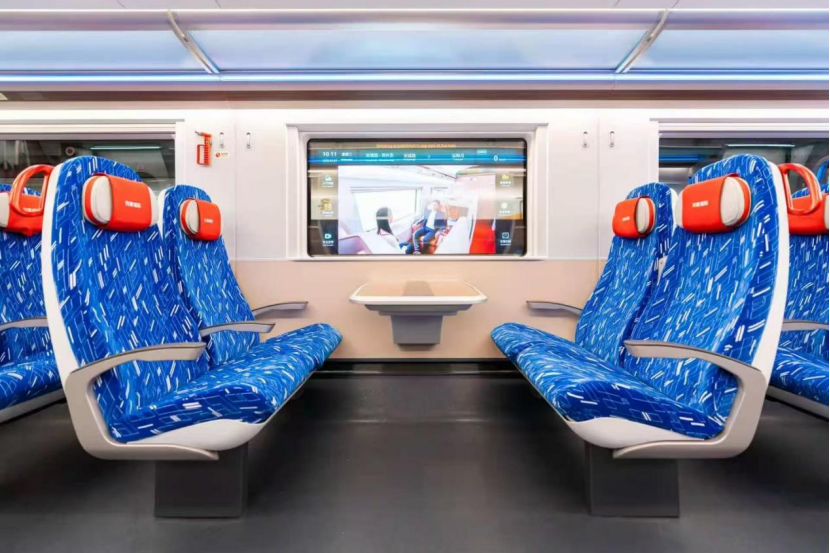 列車在智能服務(wù)、智能監(jiān)控及智能運(yùn)維等方面進(jìn)行了全面升級,車廂座席的小桌板具備無線充電功能,車廂中部安裝有兩塊智慧車窗,旅客不僅可以根據(jù)需求觀看展示視頻,還可以通過點(diǎn)擊“車窗切換”按鈕,自由控制車窗進(jìn)光模式,沉浸式享受更融洽的人機(jī)交互體驗。車門上方新增了電子地圖,能夠?qū)崟r顯示各站位置及到站信息。